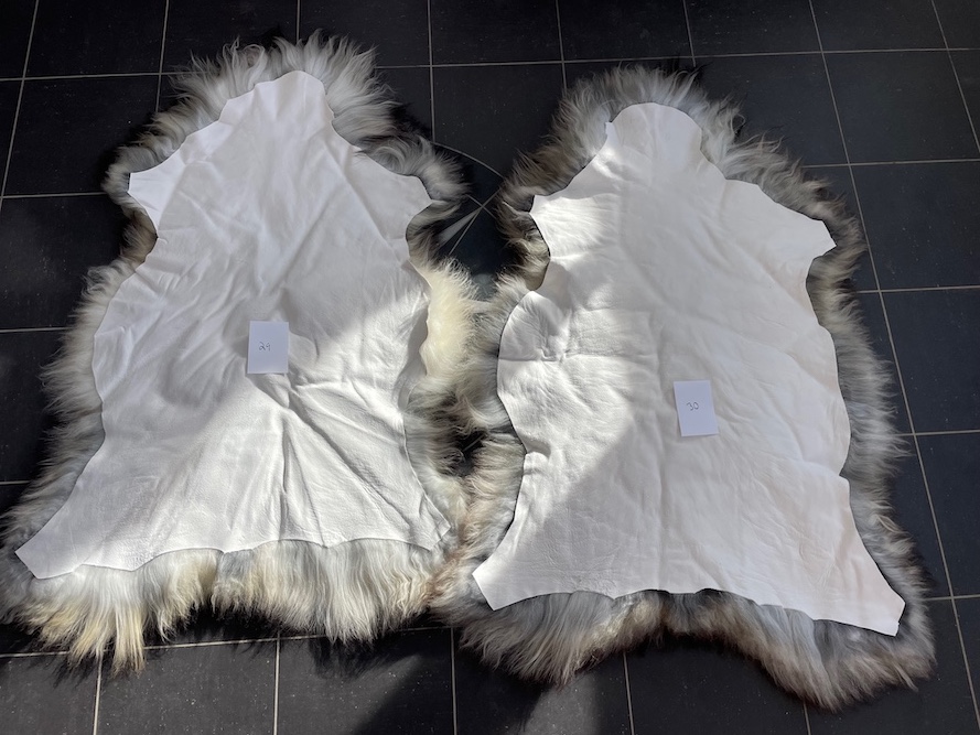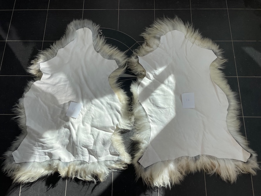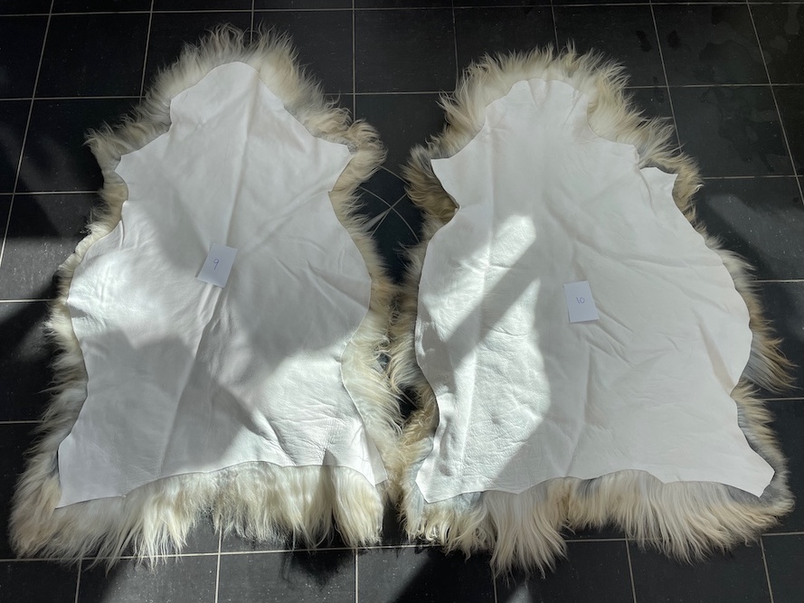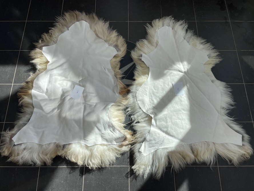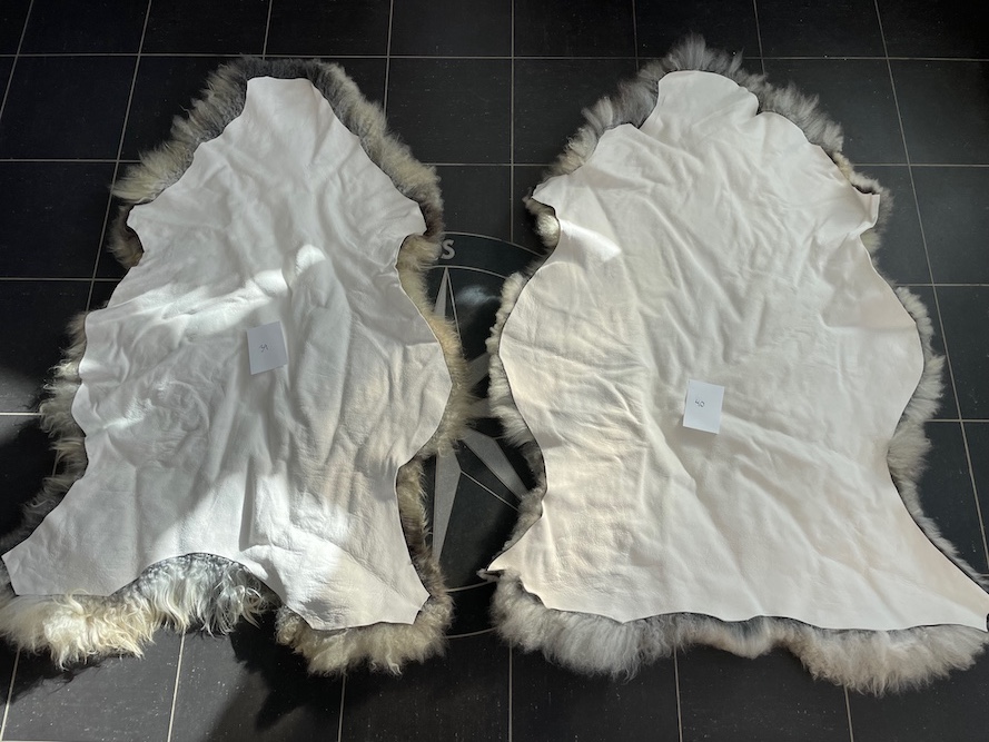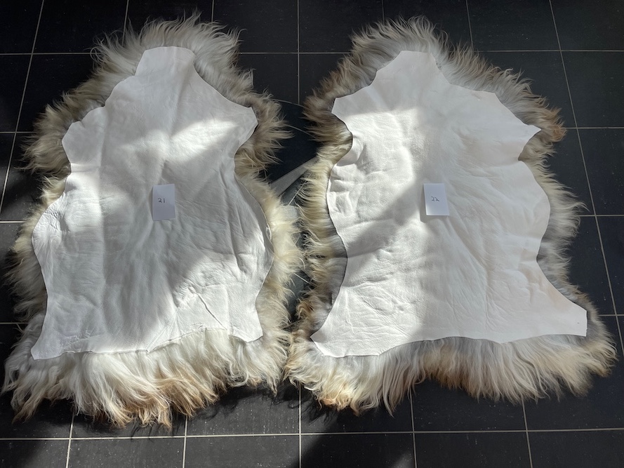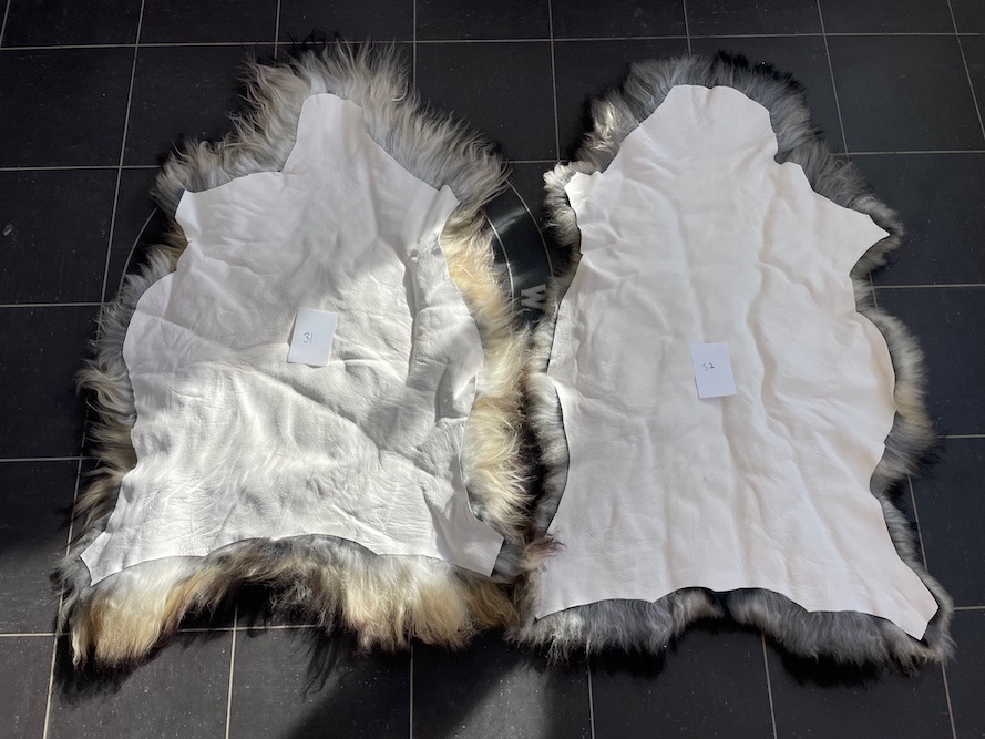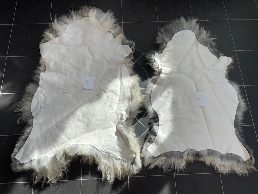 Førstemann til mølla, dette er jo skinn fra egne økologiske dyr, slaktet her hjemme, jeg har saltet skinnene selv og det er bare disse vi har før neste høst igjen når årets skinn kommer hjem fra garving.