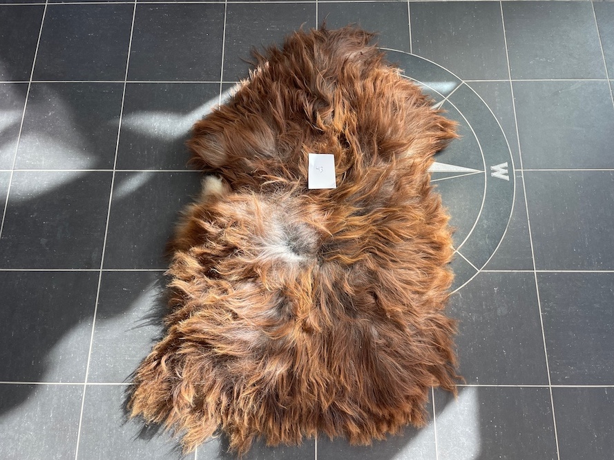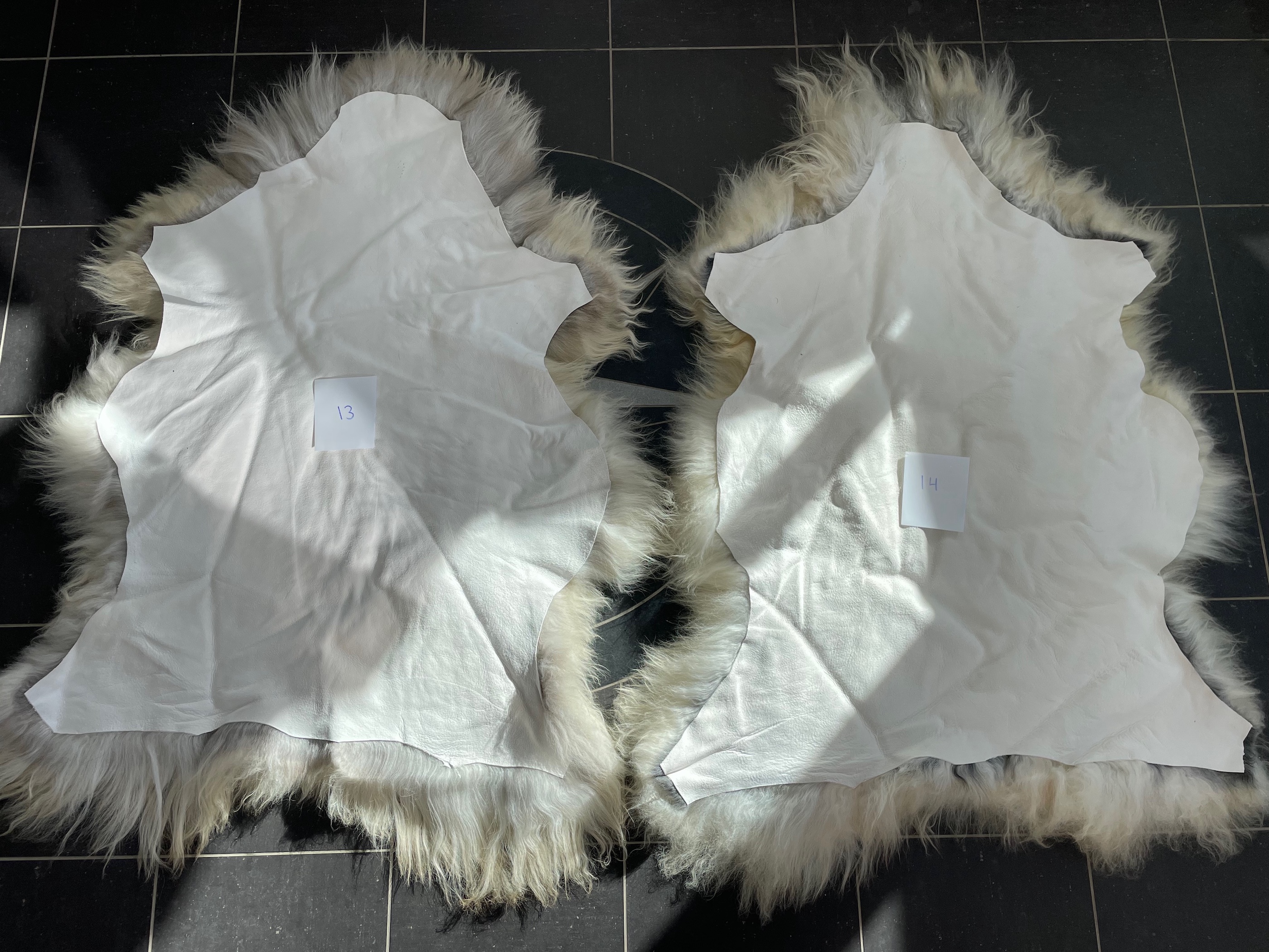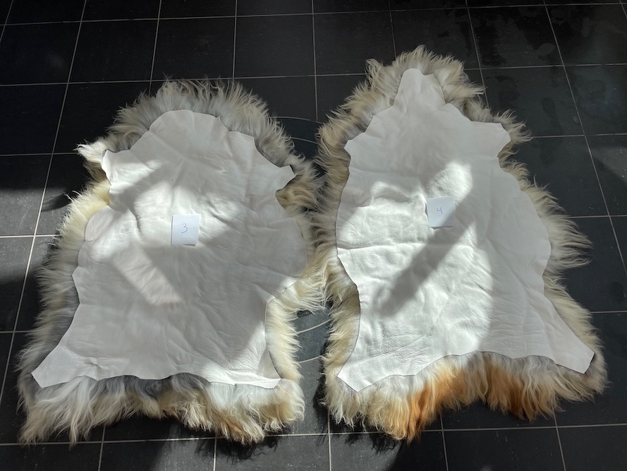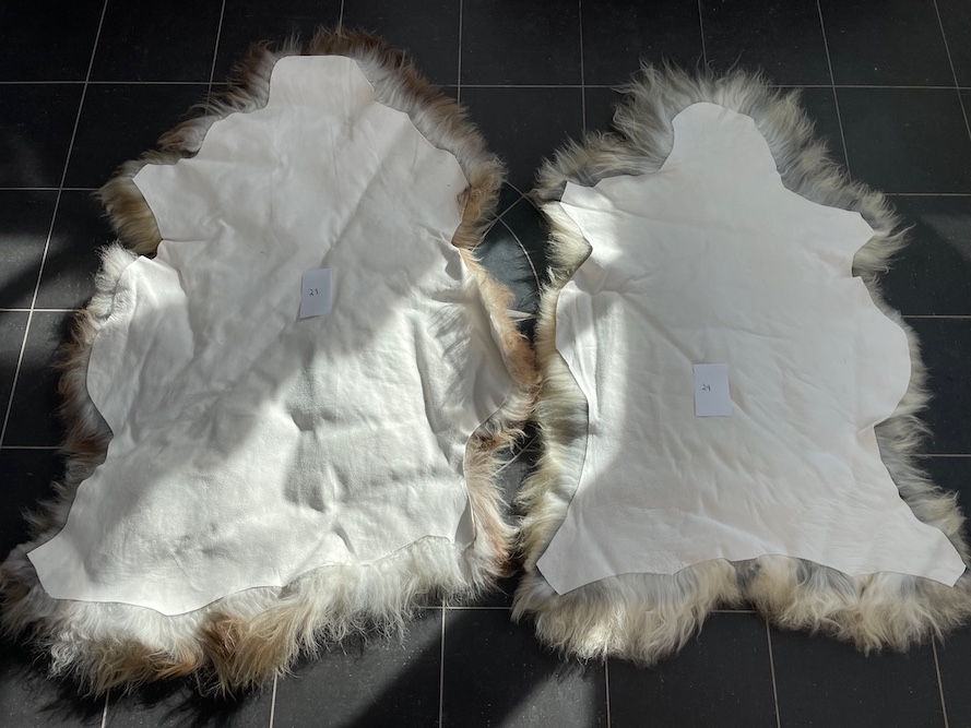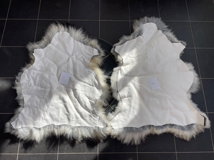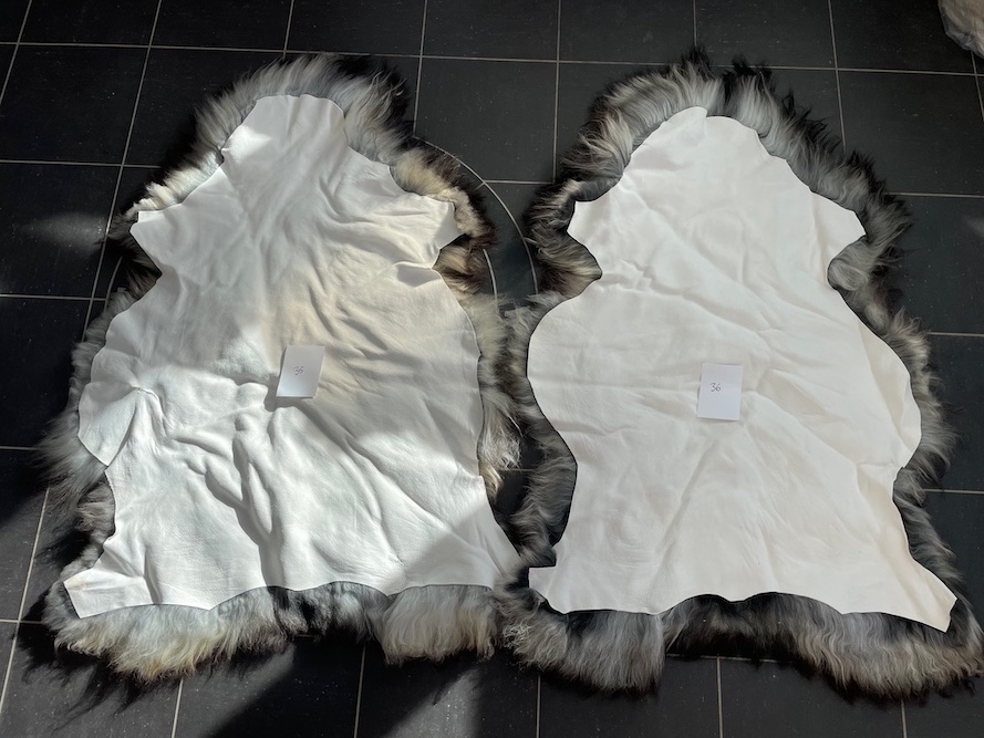 Førstemann til mølla, dette er jo skinn fra egne økologiske dyr, slaktet her hjemme, jeg har saltet skinnene selv og det er bare disse vi har før neste høst igjen når årets skinn kommer hjem fra garving.